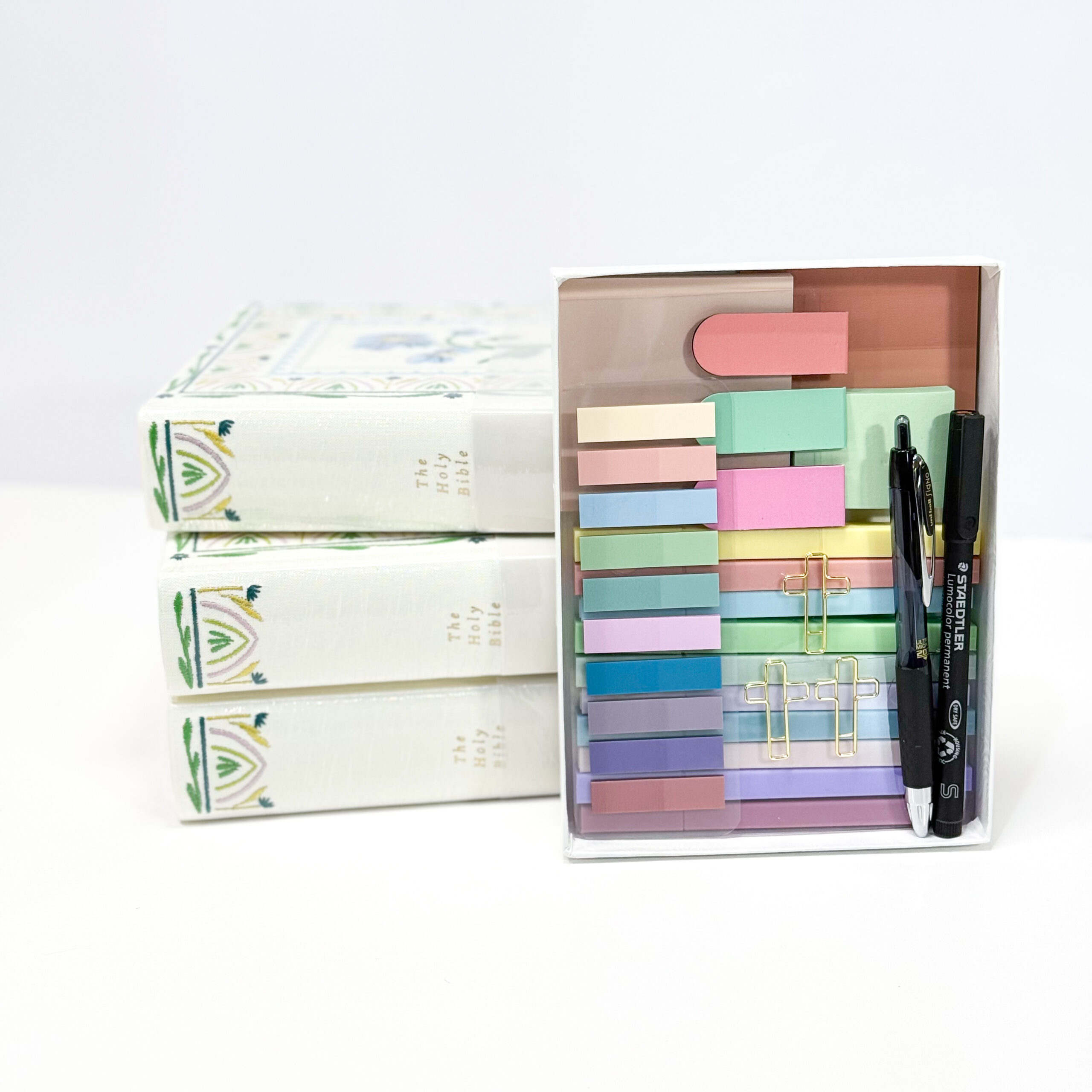 • Curated matching highlighter kit complete with 1 page of annotation flags with matching highlighters, matching sticky notes, magnetic bookmarks, cross paperclips, Staedtler Superfine permanent pen, and an ultra micro Uniball gel pen.